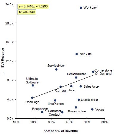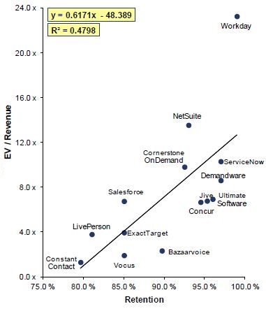 Growth is by far the most important metric of all. The annual growth rate will determine whether a startup is inscribed in the book of life or not. As a VC it is easier to pay a large premium for fast growing SaaS companies since you know the company will “grow” into the valuation, so you are basically just paying in advance. On the other hand, if a startup is not growing fast enough, it will find it very difficult to raise outside capital. Public investors are also willing to pay a large premium for fast growing companies especially in a low growth environment as we have today. The graph below shows the strong correlation between a SaaS company growth rate and the revenue multiple it gets in the public market: